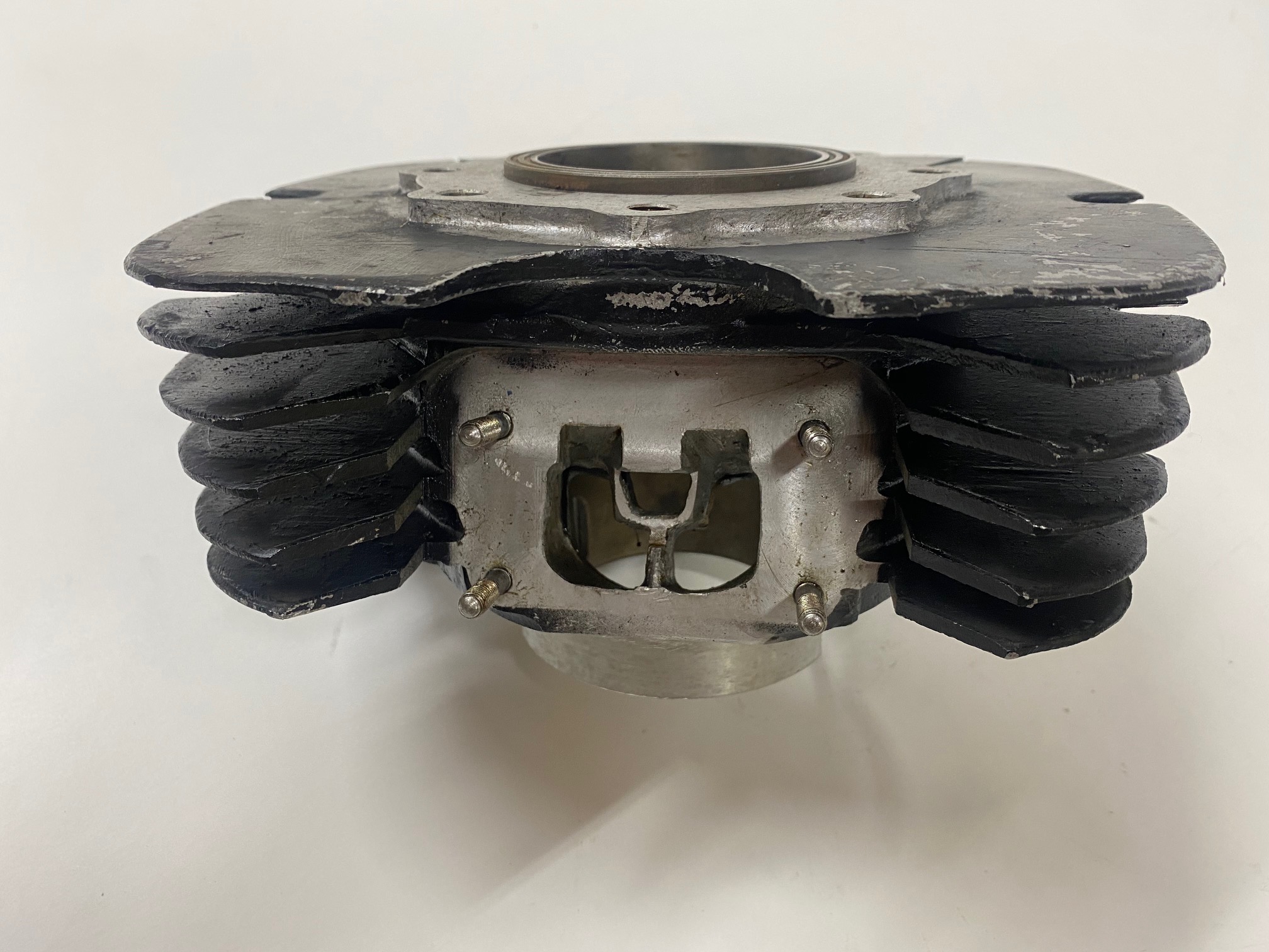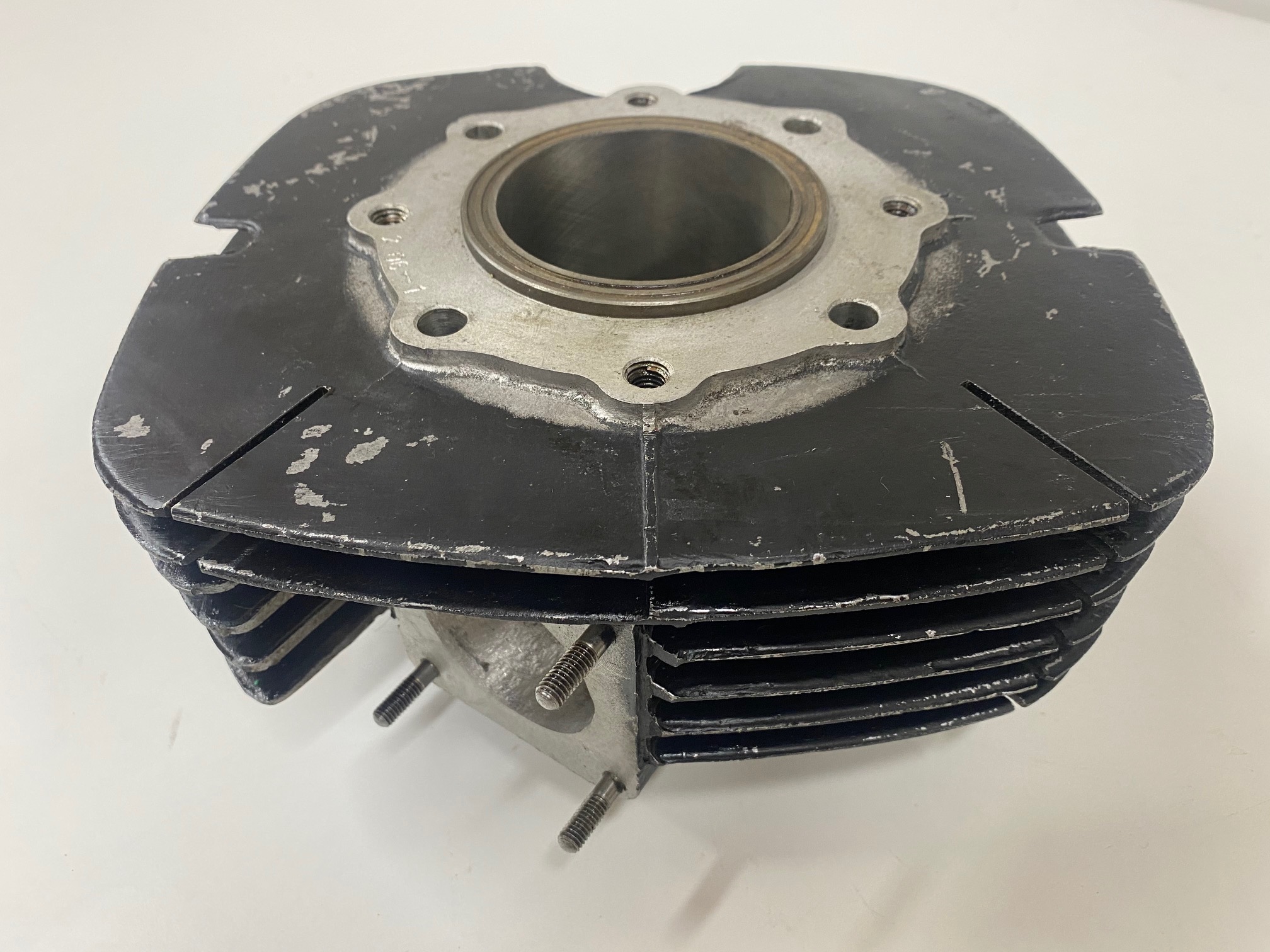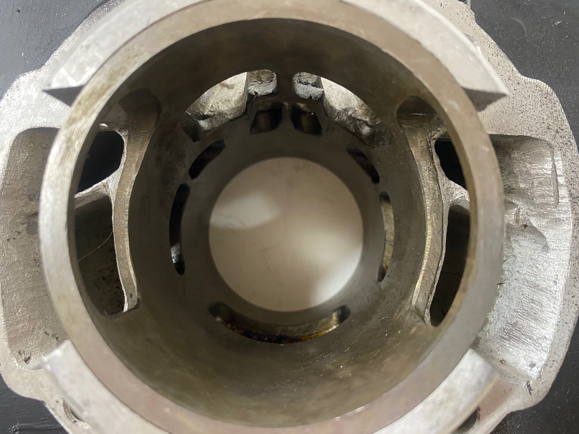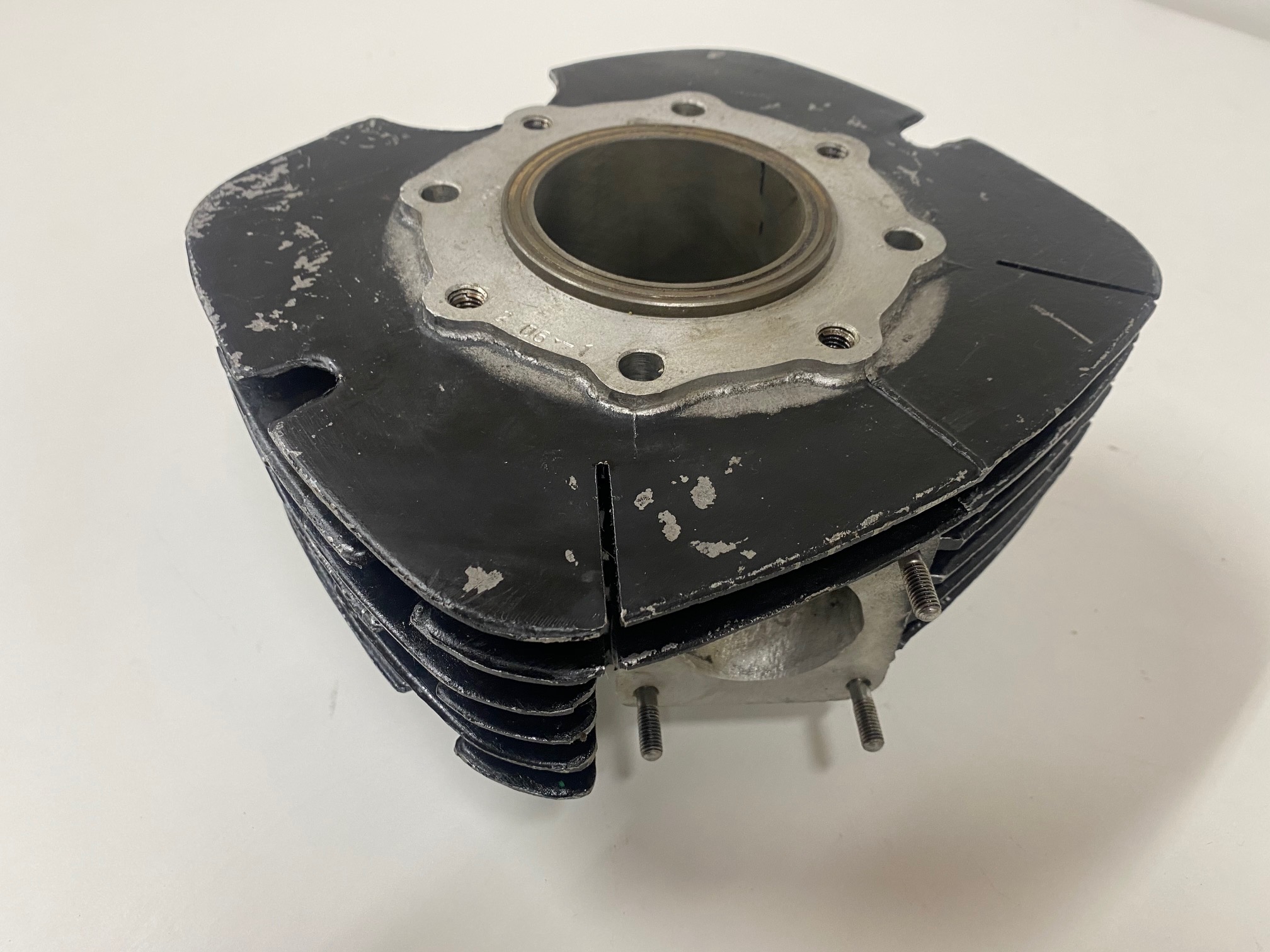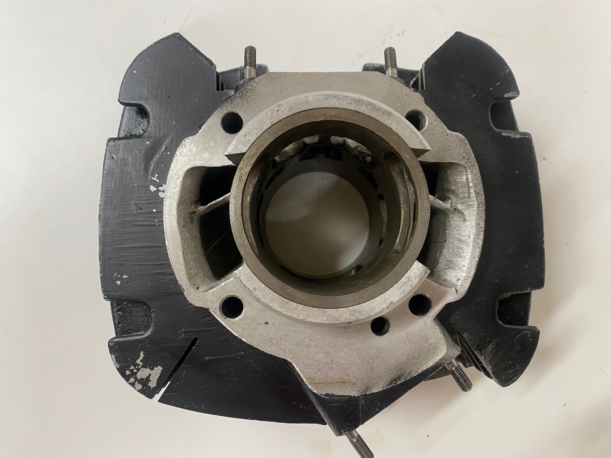 Brand new Bultaco Pursang MK-11 250 cylinder (WITH REED), taken out of its box, measuring 70.00mm. These MK-11 cylinders with reeds were the first evolution of the mk-12, they are totally the same except in the intake of the reed box that does not have the partition in the middle. In the USA you find most of the MK-11 with reeds.