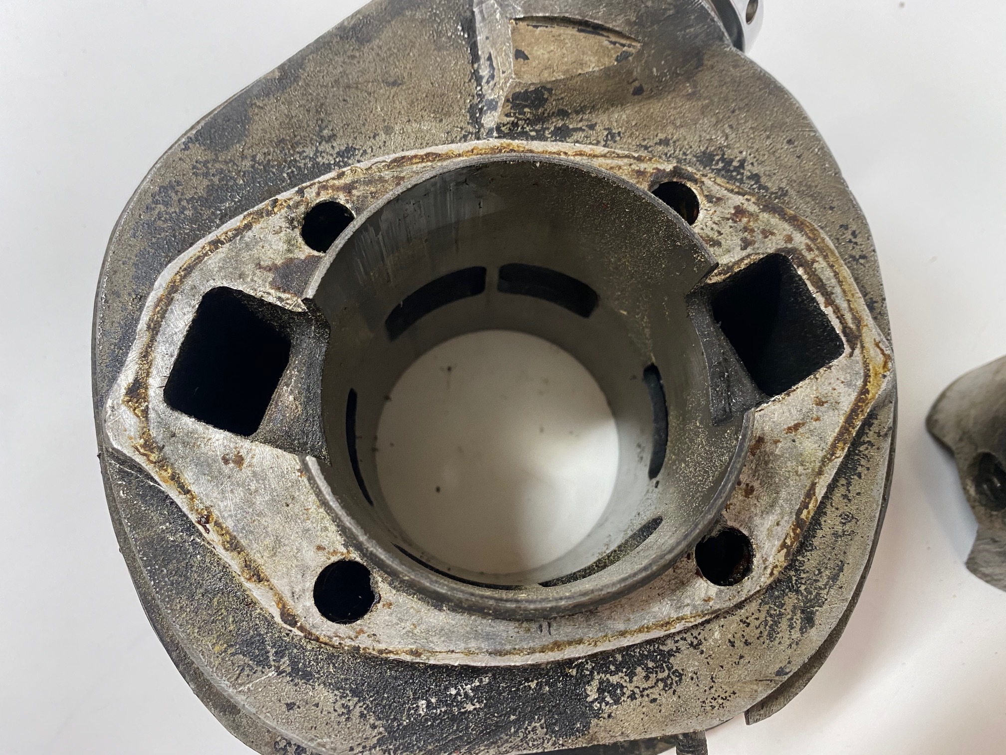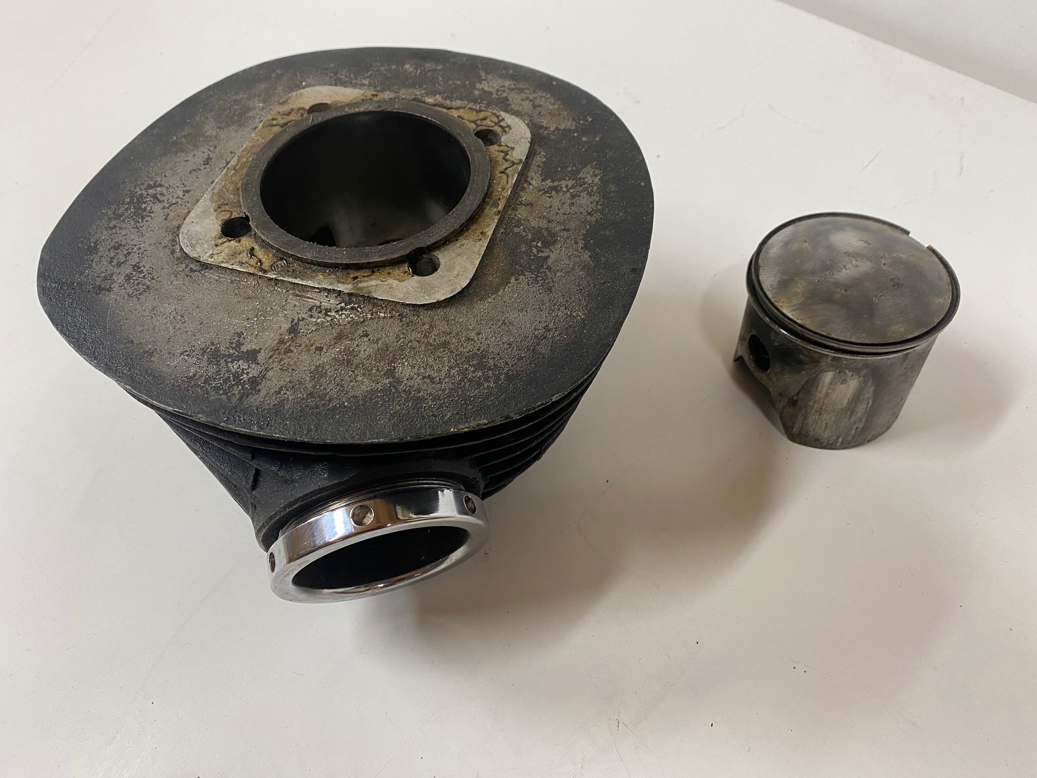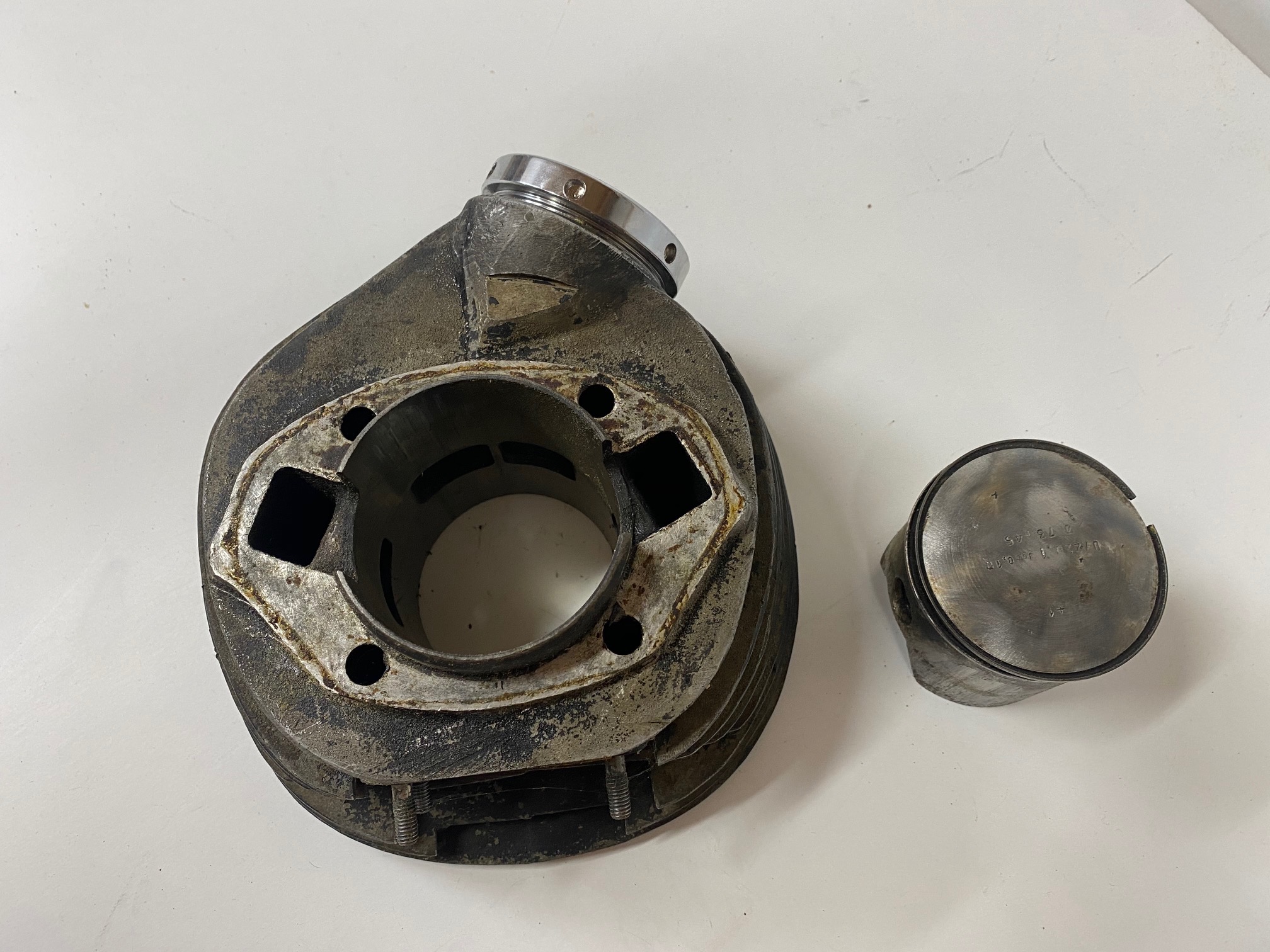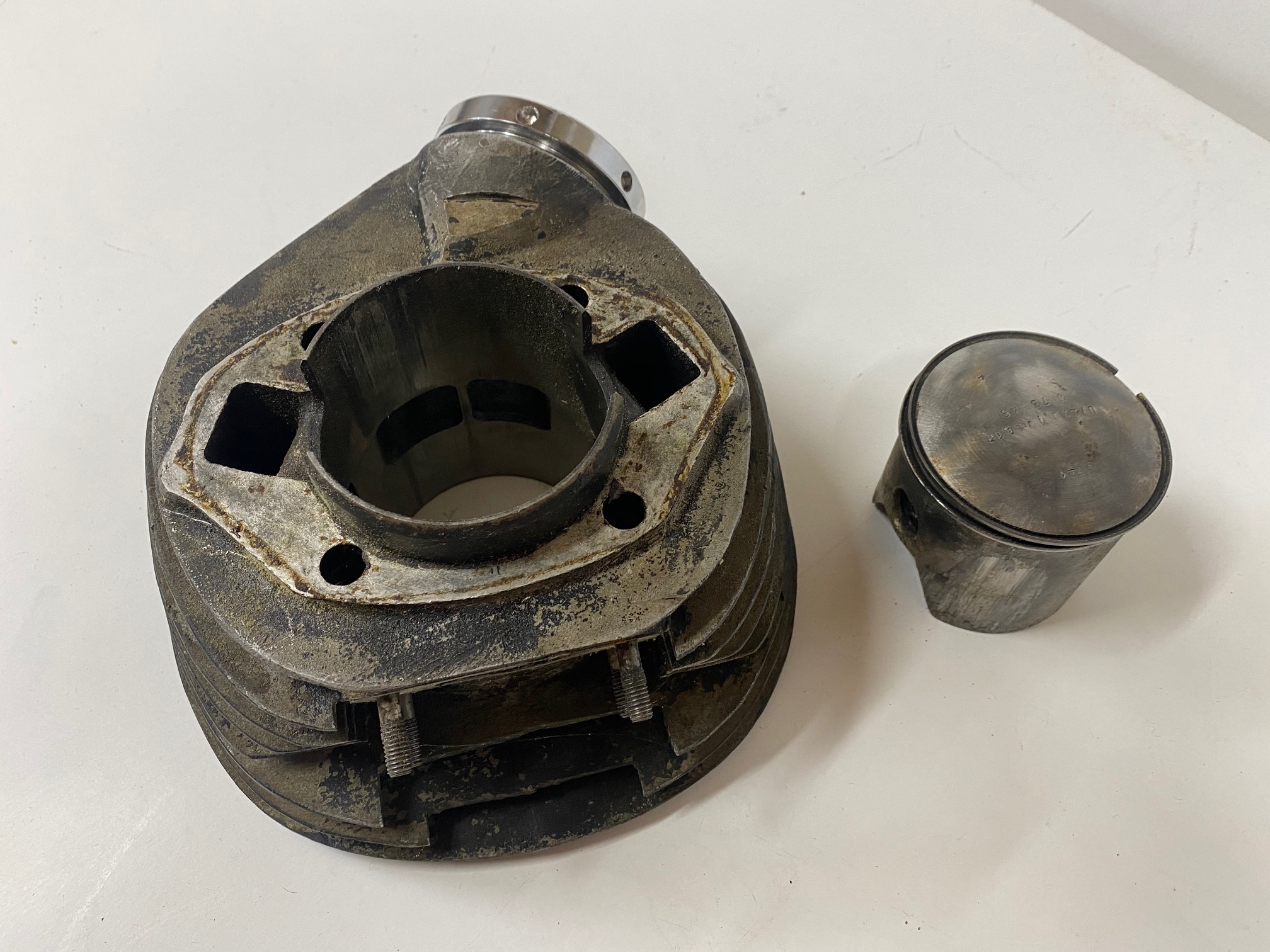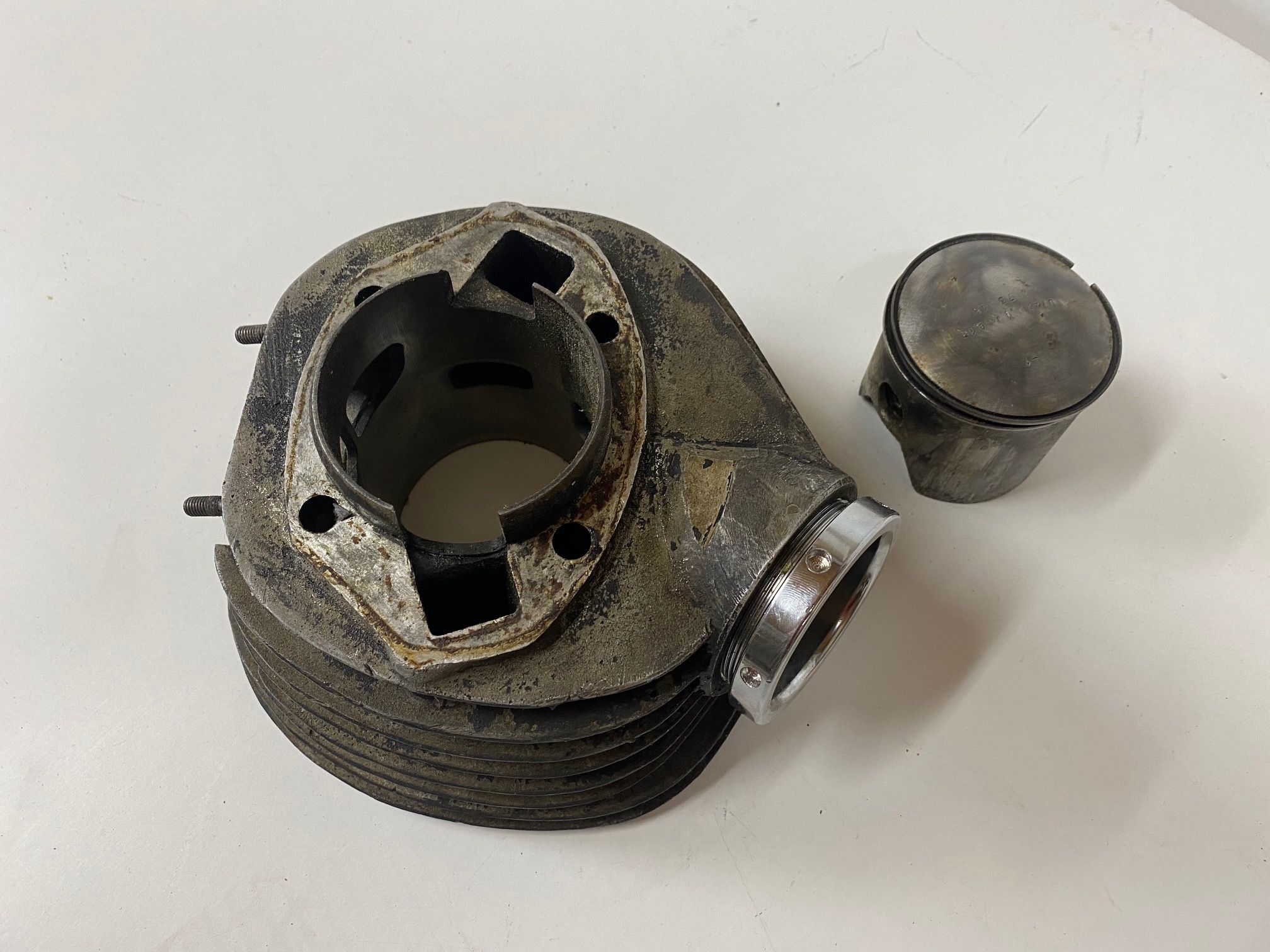 Cilindro con piston y tuerca de escape(nueva) de Montesa Impala 250 Sport.Material bastante dificil de ver a la venta,una buena oportunidad para terminar una moto.El piston tiene alguna marca,podria valer pero creo que lo logico es poner uno nuevo.La rosca del escape esta muy bien y la tuerca es nueva y esta ya cromada.