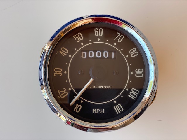 Reloj cuenta MPH de Bultaco,para las motos version Americanas,Con cuenta en millas y tornillos de 5mm para soporte de goma. Nuevo.Diametro exterir 100mm