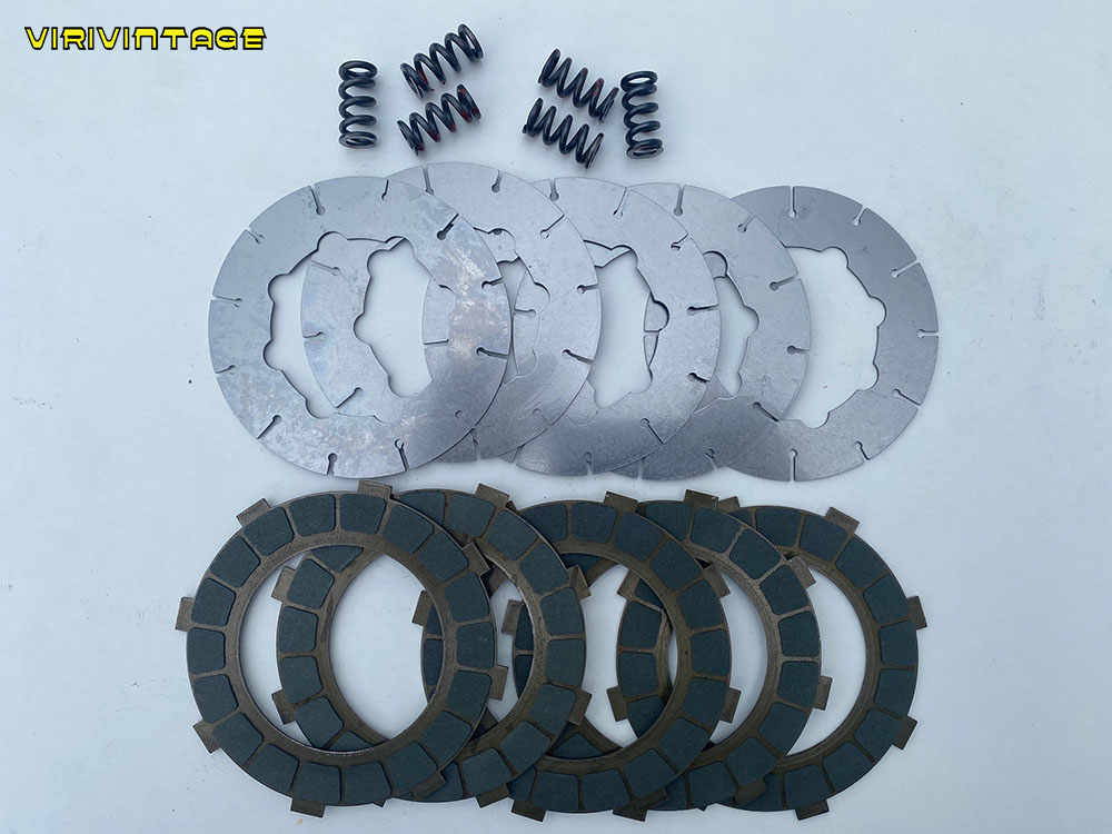Aquí tenemos otro ejemplo de que los materiales nuevos en algunas circustancias funciona mejor. Estos discos son de forro de un Keblar especial diseñado para esta funcion con el aceite y tienen un grip increible,eso junto con la opcion de poder escoger 3 tipos de dureza de muelle lo hacen una opcion buenisima para resolver uno de los grandes fallos de bultaco,el embrague. Hay 3 tipos de dureza de muelle dependiendo del uso de la moto carretera,campo,competicion. (fig. 25)